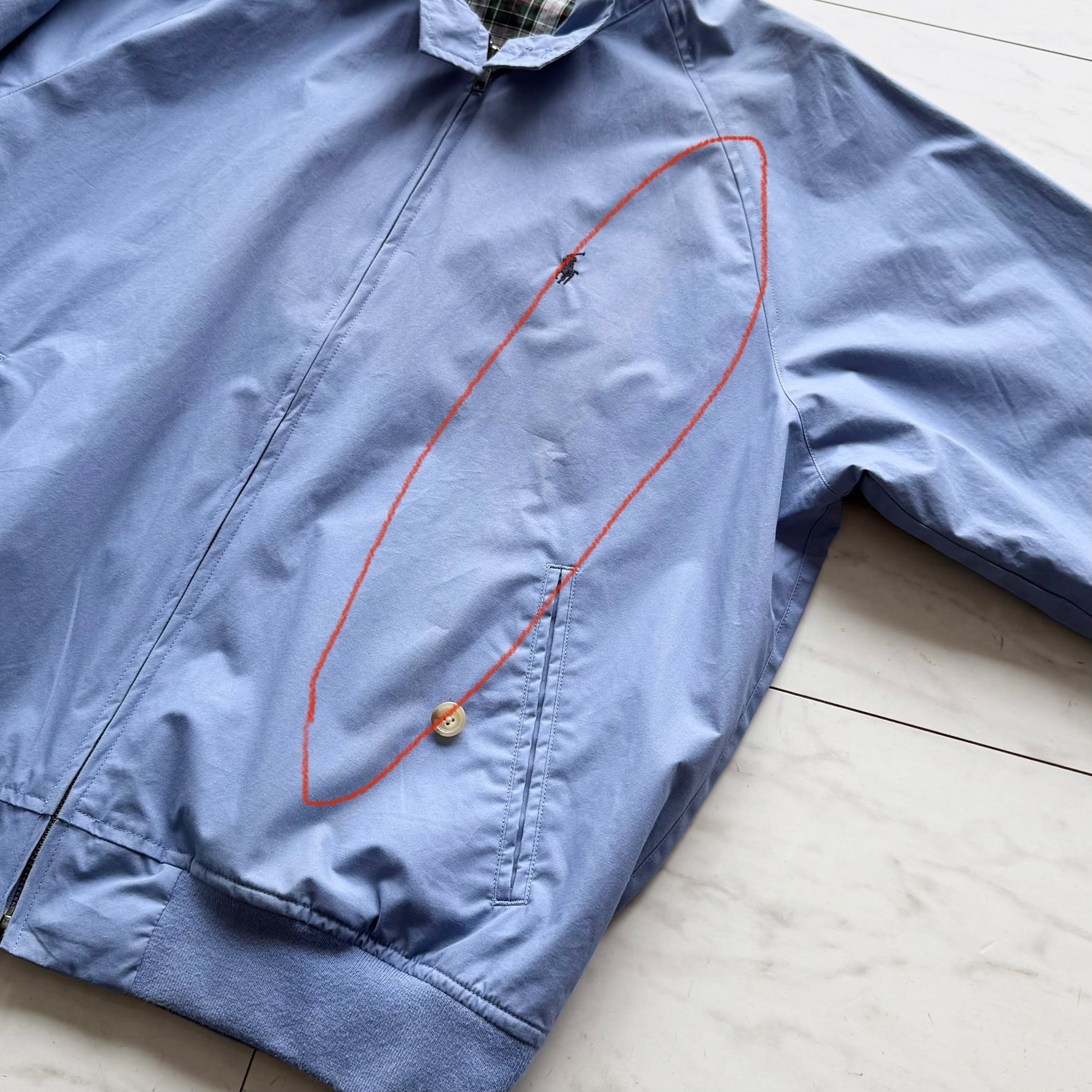 襟の折目部分に色褪せがあります。
